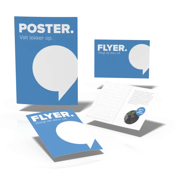 Opsomming van de items of begeleidende tekst waar het pakket voor gebruikt kan worden. In dit geval verschillende soorten promotiedrukwerk.